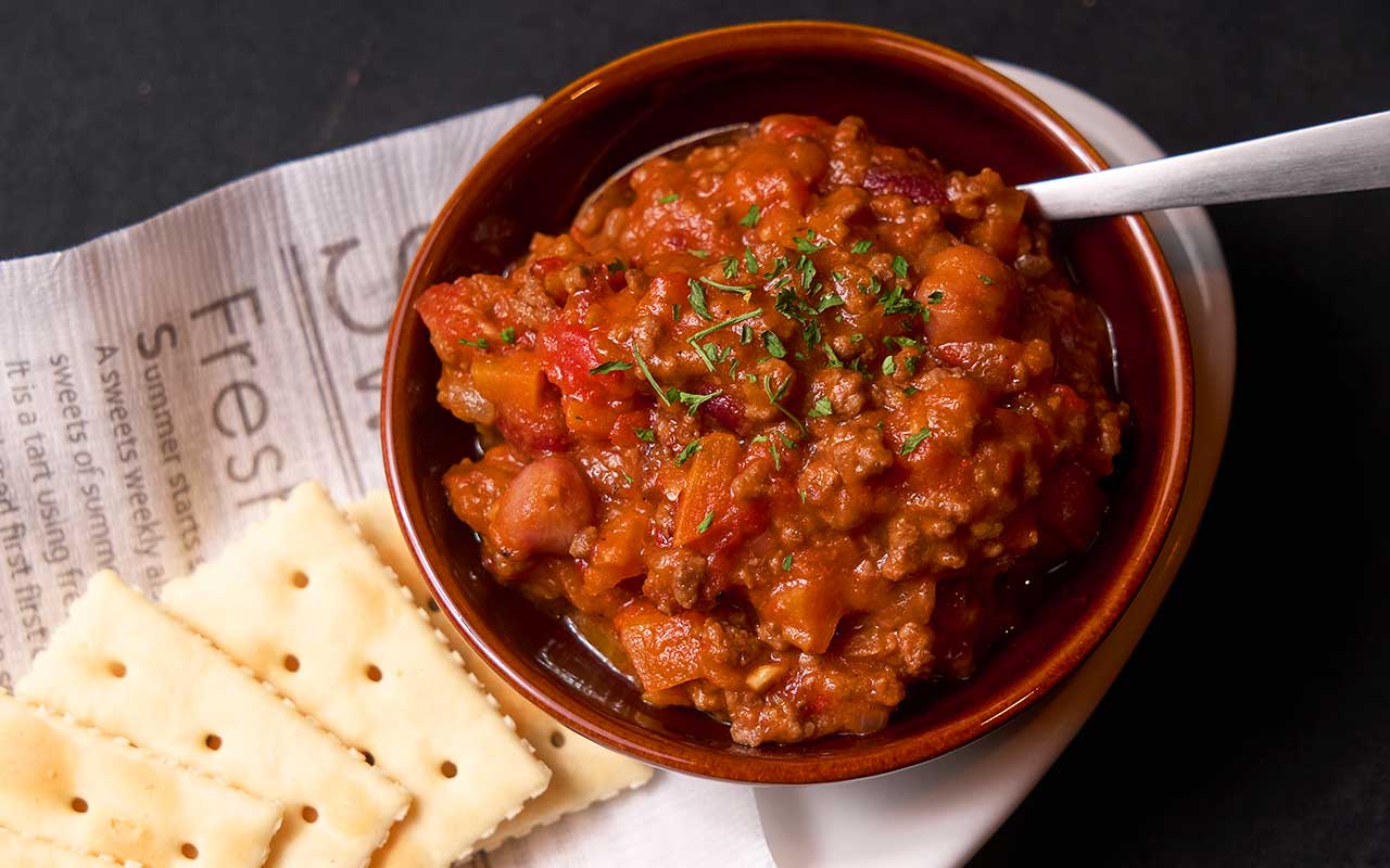 豆とひき肉をじっくり煮込んだ、やわらかな味わいのチリコンカンです。辛味をおさえているため、どなたでも穏やかに楽しめる一皿です。