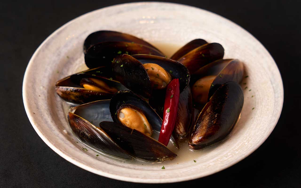 白ワインの香りと旨みをふんわりとまとわせて蒸し上げたムール貝です。やさしく広がる海の風味と、しっとりとした余韻が楽しめる一皿。