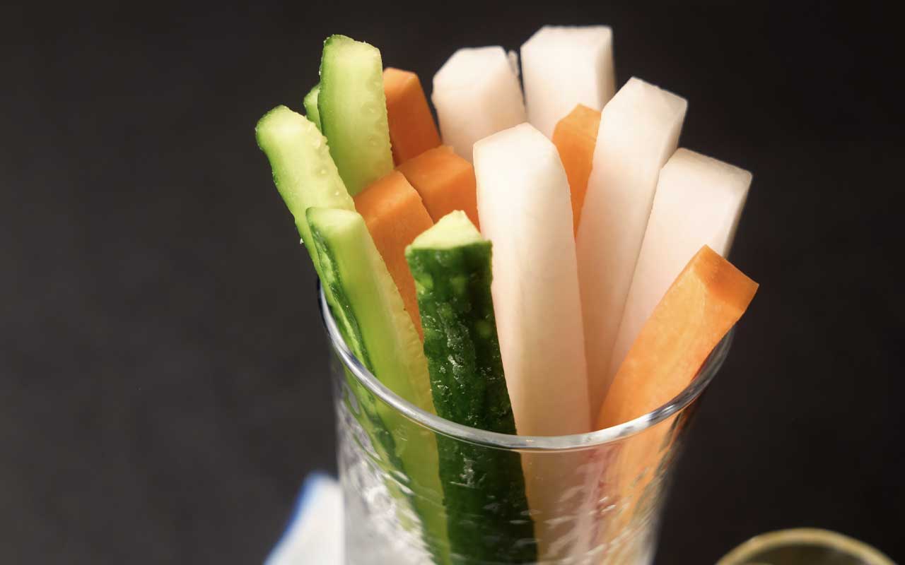 シャキッとした食感が心地よい野菜スティック。特製ディップをつけて、さっぱりと楽しめる一皿です。