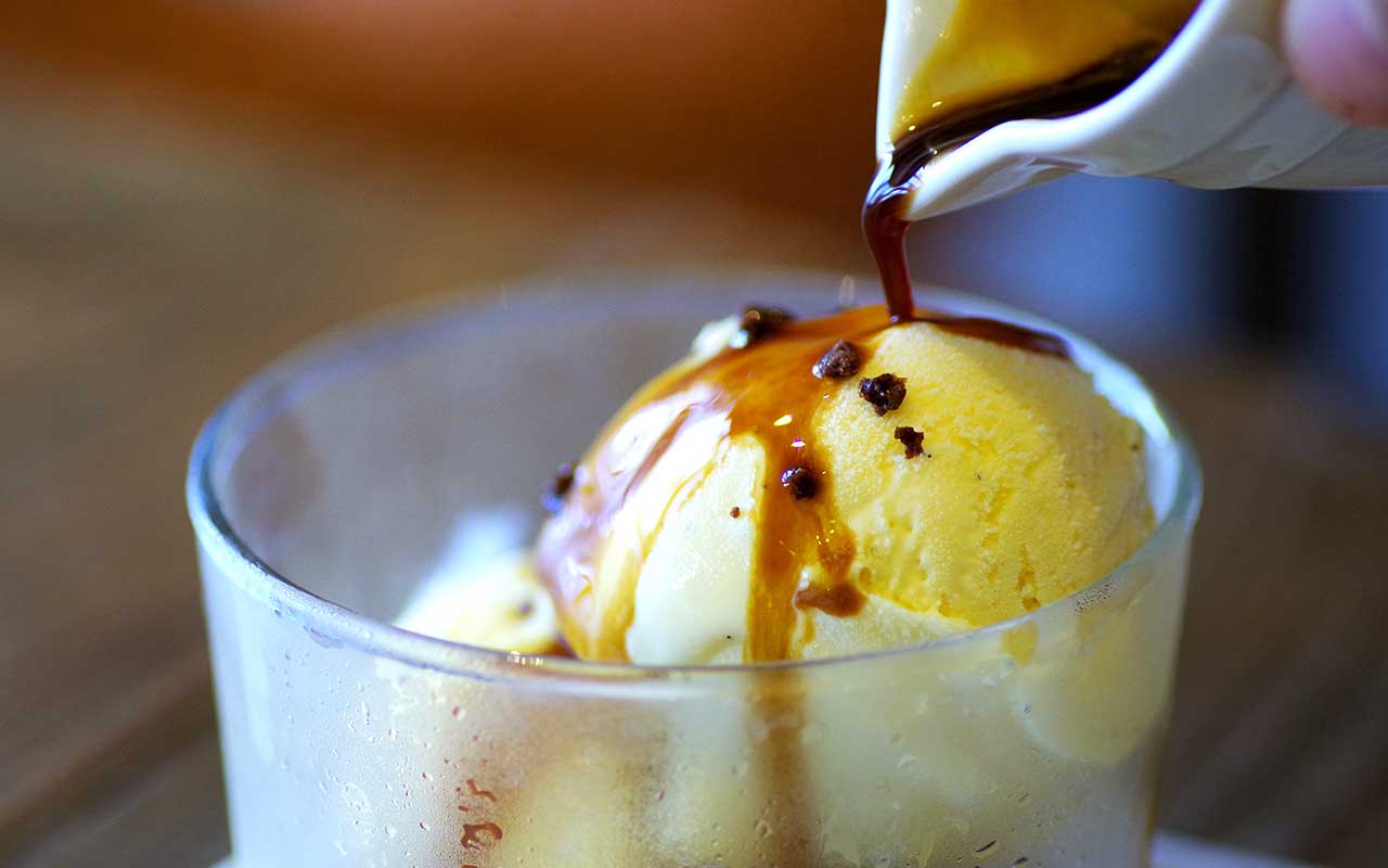 なめらかな口どけのバニラアイスに、お好みのリキュールを添えました。やさしい甘さに、ほんのりと香りが重なる、大人のためのデザートです。ゆっくりとお楽しみください。